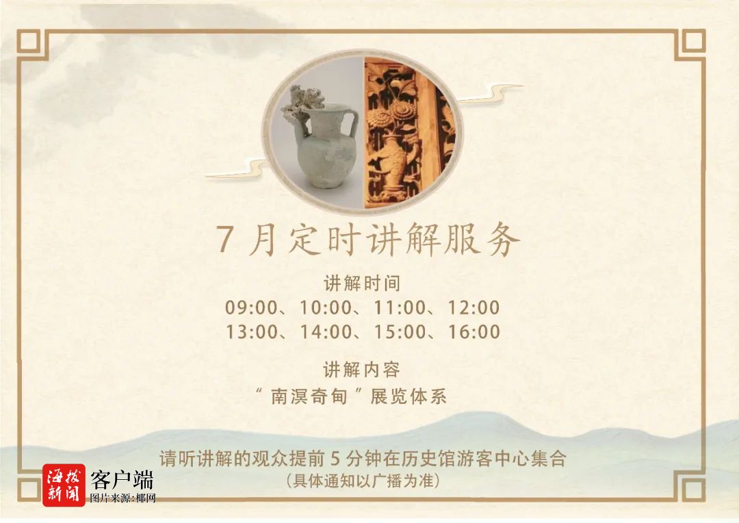 7月开放期间特别安排:1.每日整点提供免费讲解,请听讲解的观众提前5分钟在历史馆游客中心集合,任何第三方网络平台售卖的讲解服务均未获得省博物馆授权。2.适时增加现场社教活动场次,助您深度体验文化之旅!